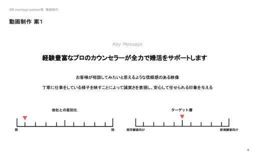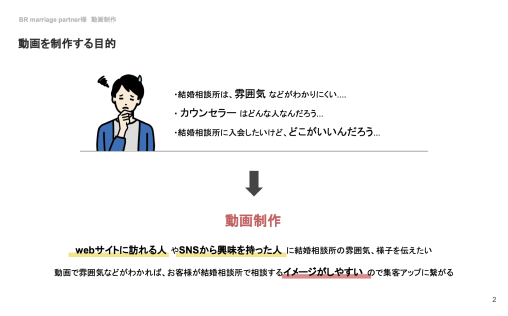 カウンセラー紹介ページに載せる代表インタビュー動画の撮影内容について提案資料を作成しました。この相談所独自の強みを活かせるような映像のビジュアル、インタビュー内容を考案しました。撮影当日はカメラマンへの指示、動画編集では肌の補正を行いました。